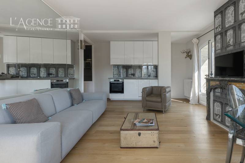 Le vaste séjour, inondé de lumière grâce à ses trois fenêtres, s’ouvre sur une cuisine américaine aux finitions haut de gamme, offrant un cadre chaleureux et sophistiqué.