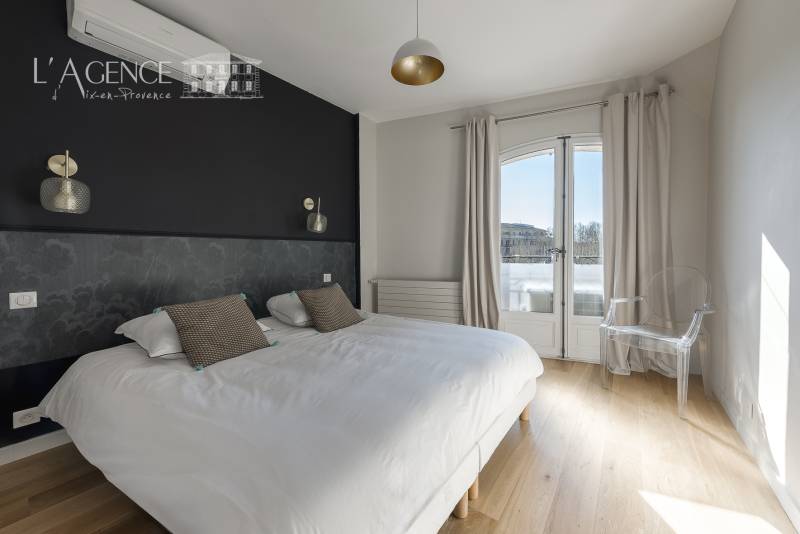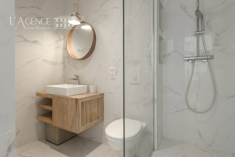 L’espace nuit comprend deux chambres élégantes, une salle d’eau avec WC et une somptueuse salle de bain en marbre, véritable invitation à la détente.