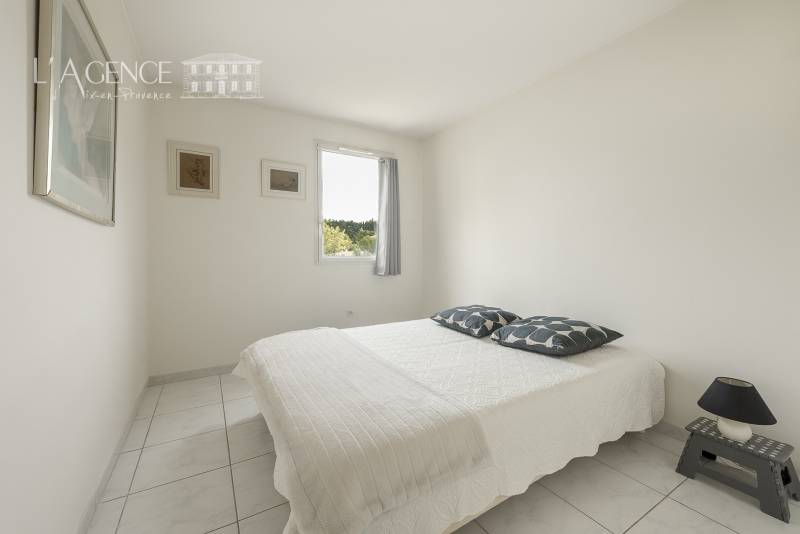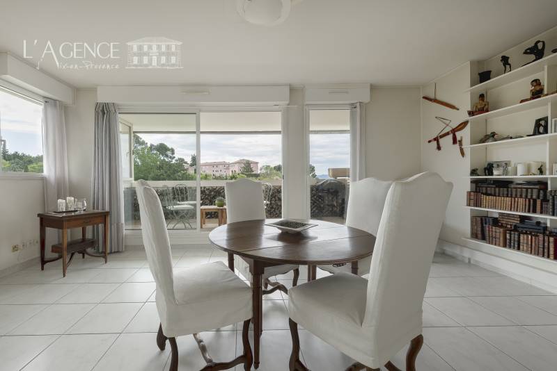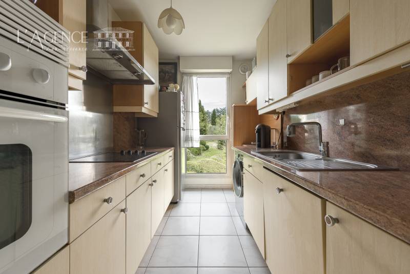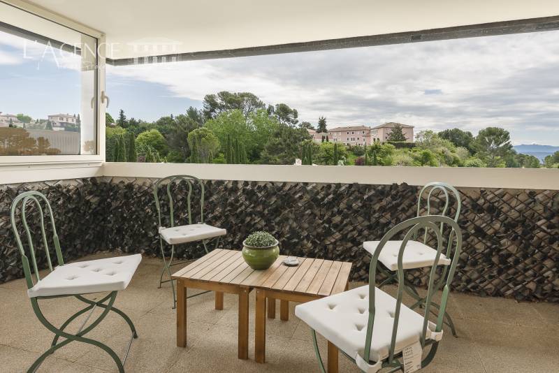 La terrasse de 11 m², accessible depuis le salon, est un véritable écrin de verdure avec sa vue dominante et son calme.
