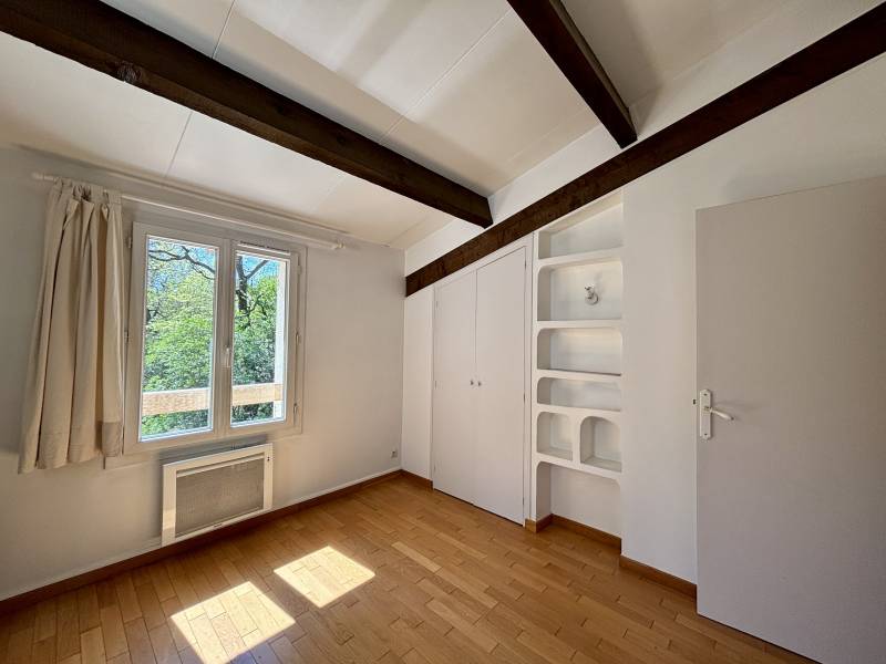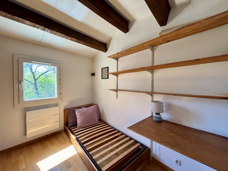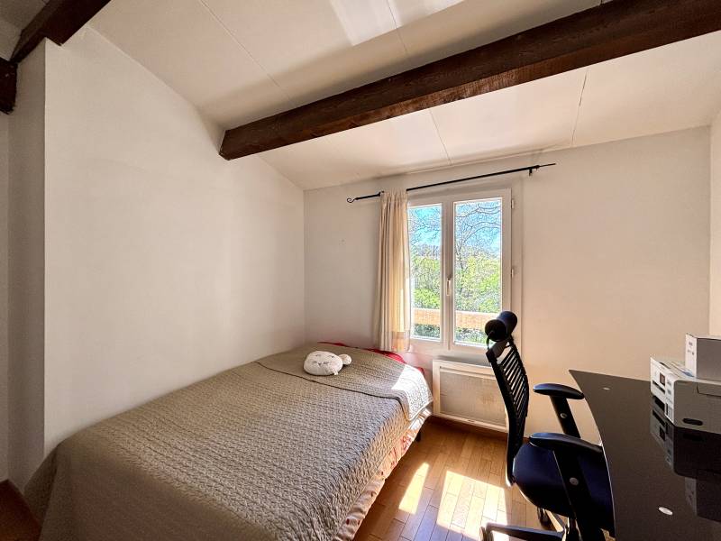 L’étage propose deux chambres, une salle de bains et des toilettes séparées. Au dernier niveau, une petite chambre / bureau, sous les toits, qui bénéficie d’une vue dégagée sur les environs.