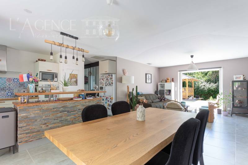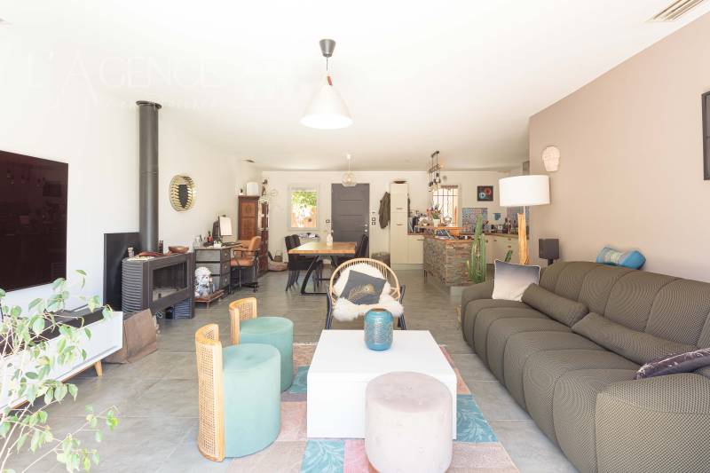 La maison dispose d'une belle pièce de réception de plus de 45 m² avec poêle à bois, incluant une cuisine équipée avec coin repas et un salon ouvrant sur la terrasse et la piscine. Le coin nuit comprend deux chambres, un bureau (ou chambre d'appoint), une salle d'eau et un WC.