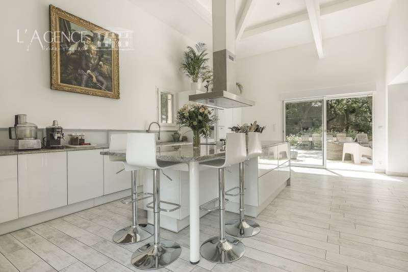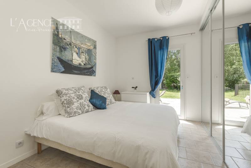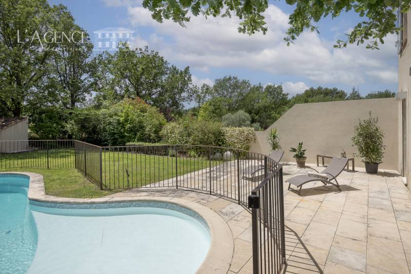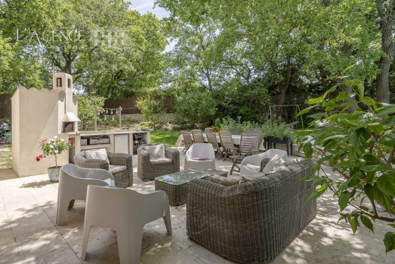 Le jardin verdoyant, véritable havre de paix, offre de nombreuses terrasses à l'ombre de grands chênes, une cuisine d'été et une belle piscine de forme libre.