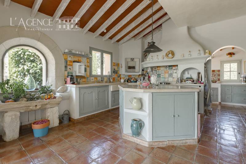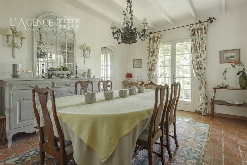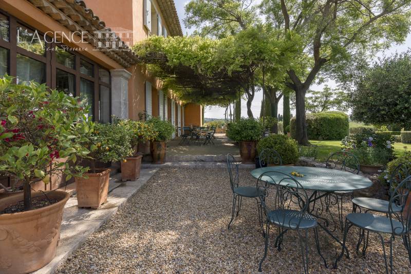 Il faut visiter la maison et son magnifique écrin pour en percevoir tout le charme. Sur 8000m2 de terrain dont la moitié en oliveraie, elle apparait dans toute sa noblesse, avec ses 4 rangs de génoises, son crépi rosé, ses belles fenêtres encadrées de bleu. Ici les cigales s'expriment, il y a des cyprès, des murets en pierre sèche, des lauriers rouges, des haies de buis, une belle végétation maîtrisée, des espaces où s'isoler, une grande terrasse abritée du soleil, des rochers autour de la piscine, une cascade, une gloriette.